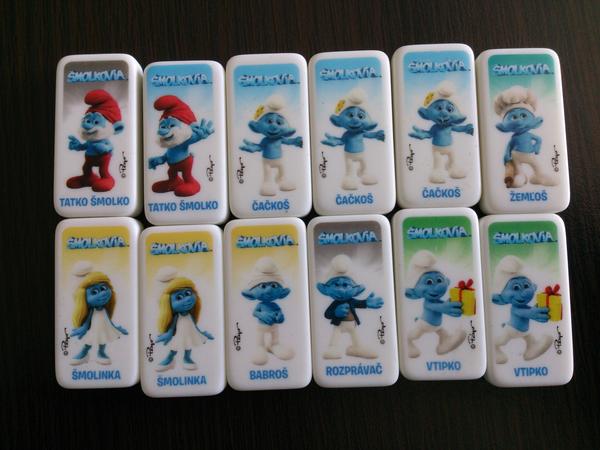 Predám TESCO DOMINO KOCKY ŠMOLKOV podľa kufríka 1-2kusy,4,5,7,8,9-3kusy,10-2kusy,11,12-3kusy, 18-3kusy,20,21,22,25 cena za kus 0,40€