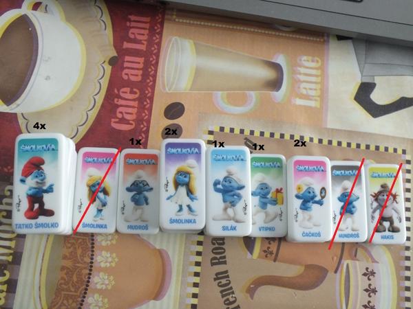 Domino kocky Šmolkovia: mám na výmenu 4, 2x5, 6, 12, 2x13, 3x15, 17, 2x20, 21, 3x22, 26, 28 a potrebujem 1, 2, 9, 11, 18, 23 a 25.