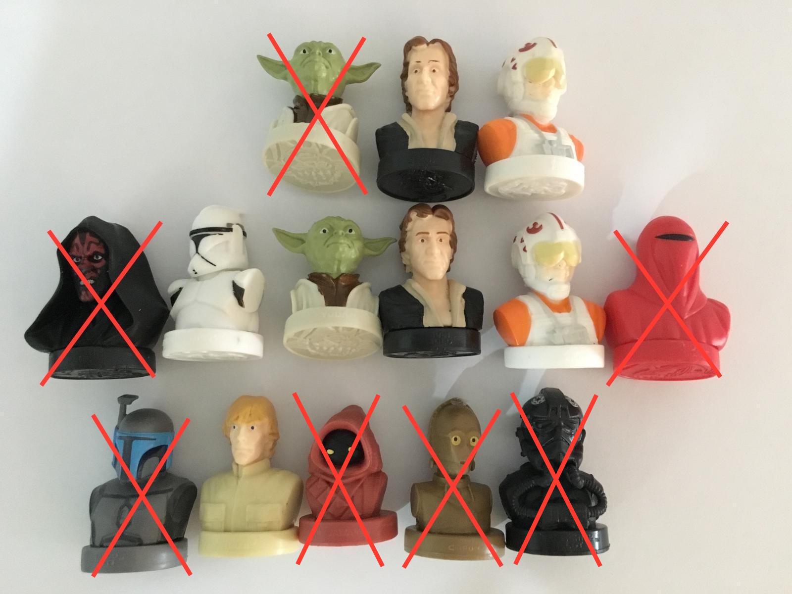 Zháňam: Anakin, Han Solo, Darth Vader, Darth Maul, Yoda a Rey, mám na výmenu Luke 3x, Royal Gaurd 3x, C-3PO 3x, Kylo Ren, Chewbacca, Jango Fett, Stormtrooper