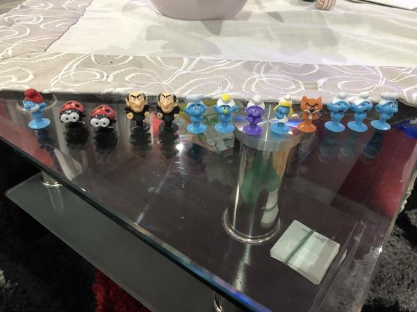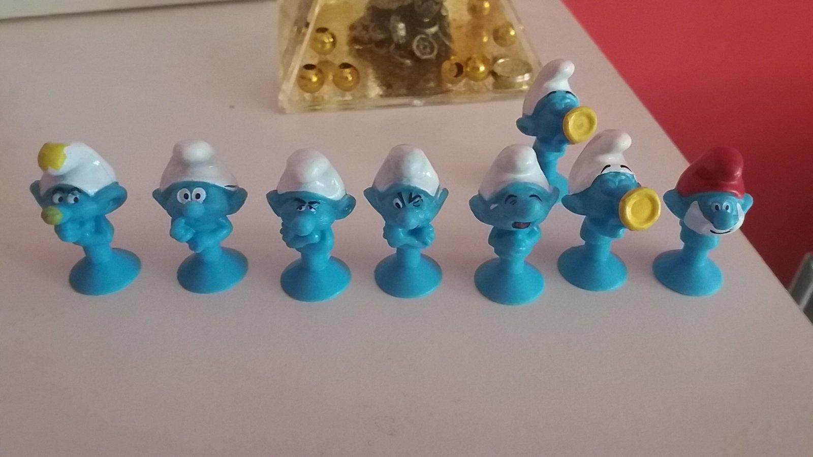 Ahoj. Nam chýbajú Gargamel, Smoulinka a Silak. Na výmenu máme Farmára, fialoveho Smolka, Básnika, Divoška, Búrku, Šmolka, Hladosa, Snappy a Mudroša.
