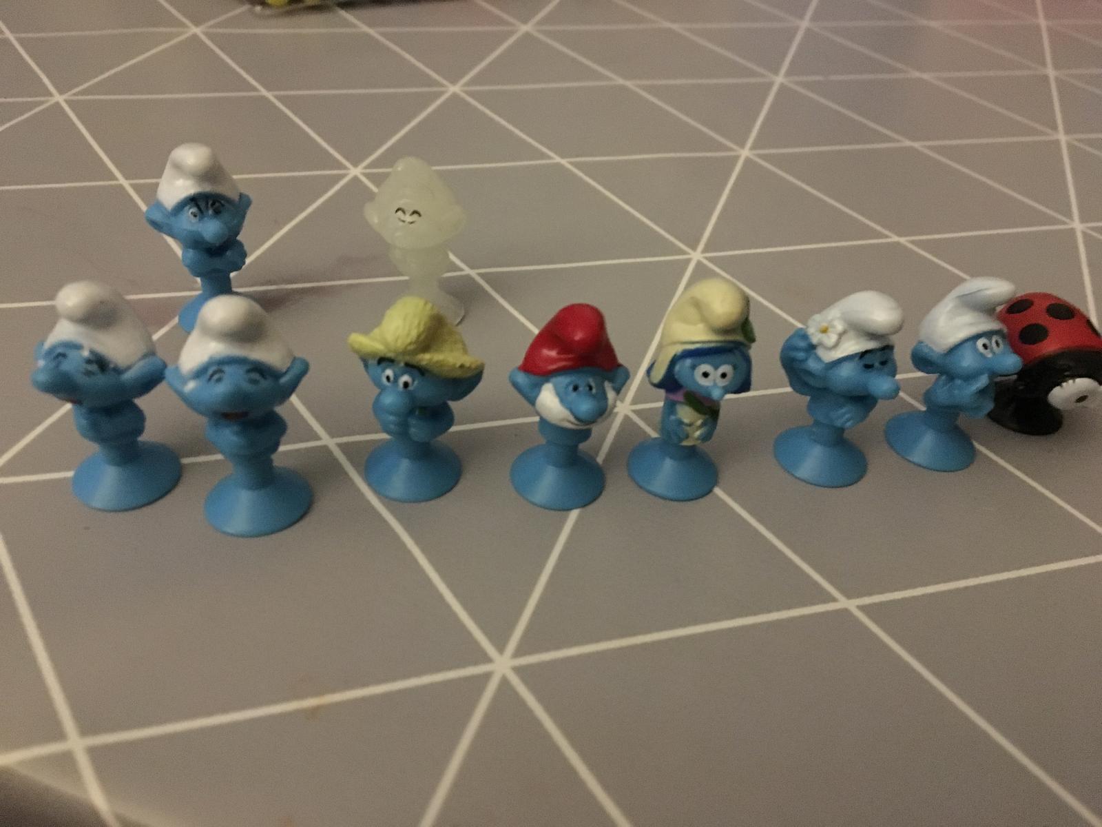 Máme na výmenu: smoulinku búrku hundrosa a azraela. Potrebujeme: tatko smolko, purpurovy smolko, hlados, mudros,divosko smolko, vtipko, trubkar,farmár, básnik a KUFRIK