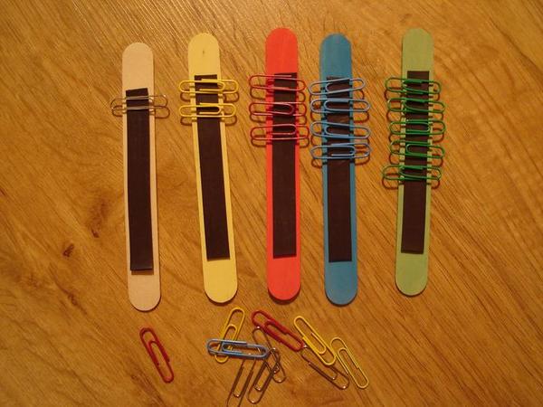 Drevené lopatky lekárske polepené rôznymi zaujímavými vecami. Boli by označené číslami 1 - 10. Na každej lopatke by podľa čísla bolo nalepené z iného materiálu toľko kusov, koľko hovorí číslo.(gombičky, vata, postrihaná slamka......)