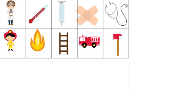 - v tom prvom by boli prvé osoby (doktor, policajt...) už vytlačené na zalaminovanom papiery a priraďovali by sme ku remeslu príslušné nástroje na kartičkách, ktoré by boli podlepené suchým zipsom . Takýchto A4 papierov by som spravila 3-4, na každom by boli 3 osoby, resp. veci ku ktorým by sme priraďovali čo k tomu patrí.