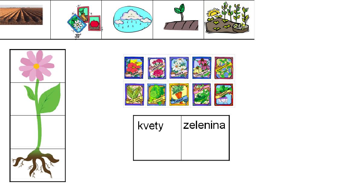 - druhý návrh je "záhrada": spravila by som 4 zalaminované strany. Všetky by sa týkali záhrady. Na prvom papiery by mohla byť časová postupnosť: "zasadia sa semienka, zaprší, vyrastie rastlinka..." a ešte niečo... na ďalšom by bolo puzzle kvetinka" a ešte nejaké "puzzle", na ďalšom by bolo priradenie kartičiek zelenina, kvetinka... všetky kartičky by boli zalaminované a podlepené suchým zipsom