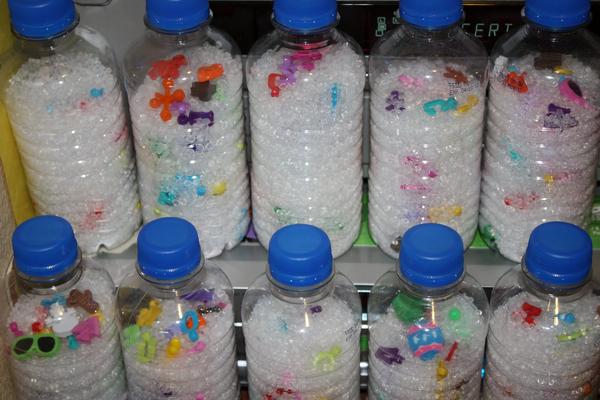 d)ispy bottle + karticky s jednotlivymi vecami, ktore su zvnutri (tu by som urobila iba sadu veci+tie karticky, posielat flase s ryzou by sa predrazilo) napr.sada veci minca,lego kocka, auticko, srubik, gombik, zvieratko,kamienok,siska,brmbolec,klucik ?, farbicka-pastelka, panacik z clovecka atd... (15-20 veci)