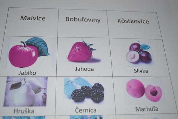 3. Ovocie – rozdelenie na malvice, kôstkovice, bobule – každá skupinka kartičiek zalaminovaná a spojená kolieskom na kľúče ... + básničky