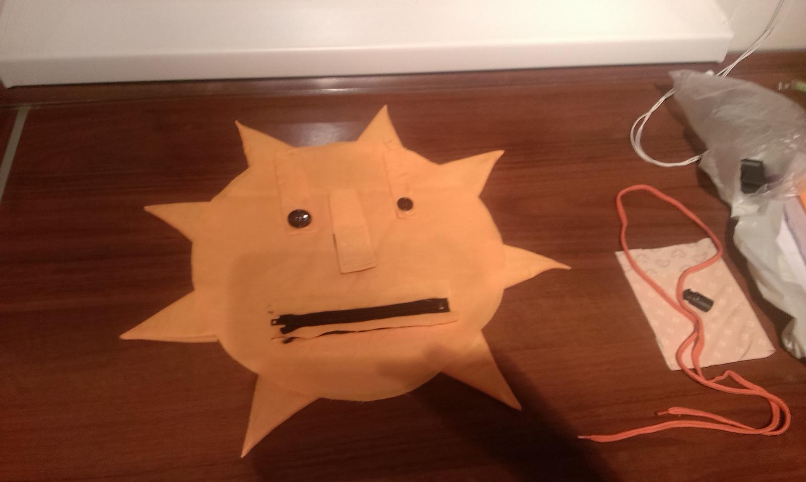 ahojte dievcata, ako som pisala pri obrazku, namiesto macka som vymyslela iny tvar, bolo by to slniecko, vpredu bude mat oci na gombiky, nos na suchy zips, usta normalny zips, zo zadu by malo na chrbate ruksak, ten bude mat na sebe snurku na stiahnutie, zapinanie na klips a pripnuty bude zospodu na cvoky....este to nemam cele zosite, len posielam obrazok s návrhom ako by to asi vyzeralo, tak dajte vediet, ci to moze byt, aby som mohla objednat material