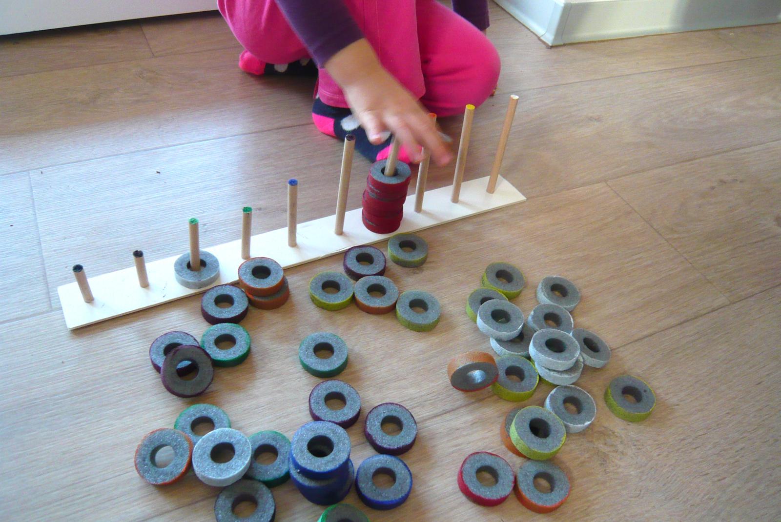 Ešte okolo každej paličky dolu plánujem namaľovať farebný kruh, aby to bolo jednoduchšie aj pre menšie detičky. Zatiaľ sú farby len na paličkách.