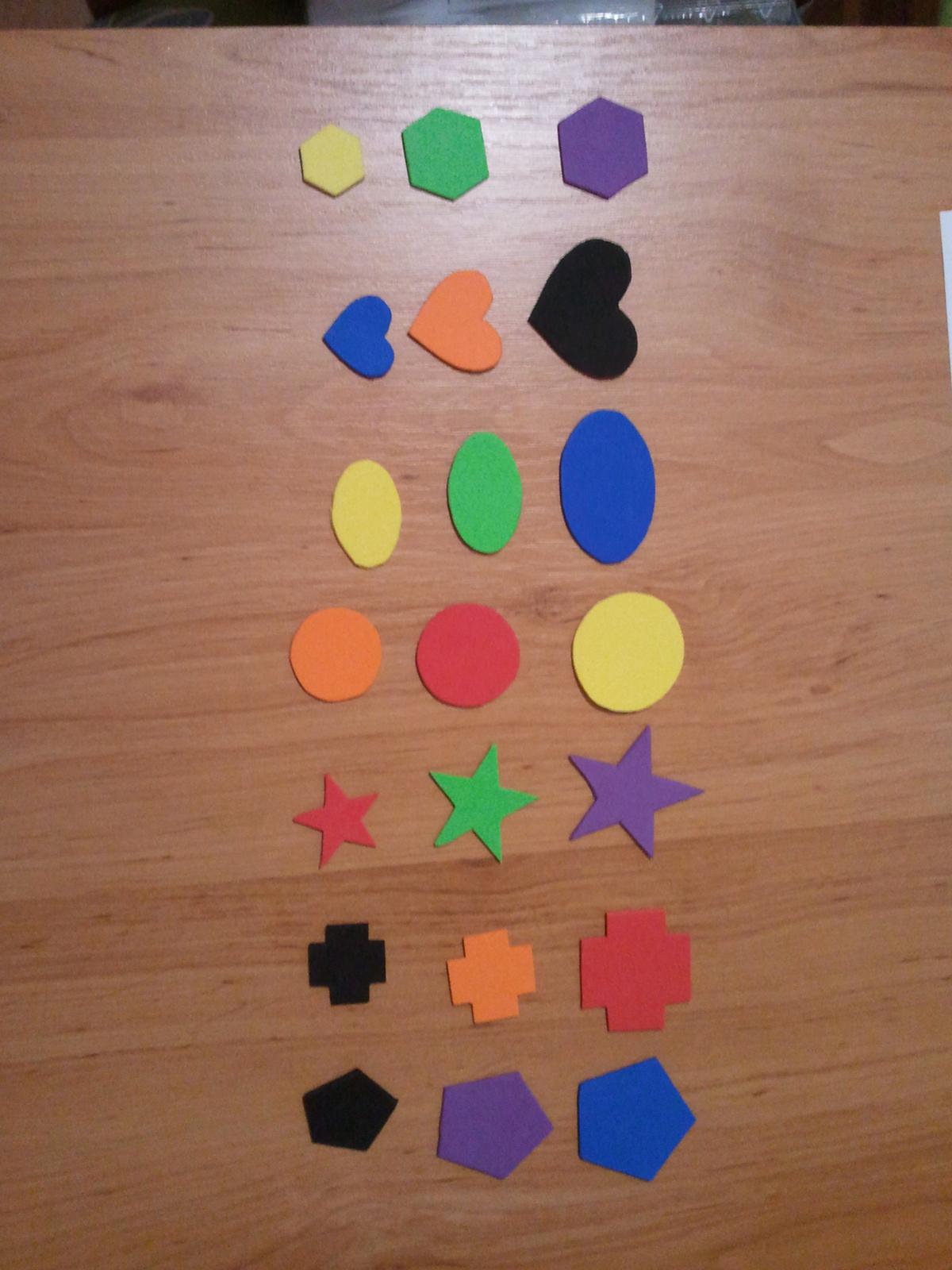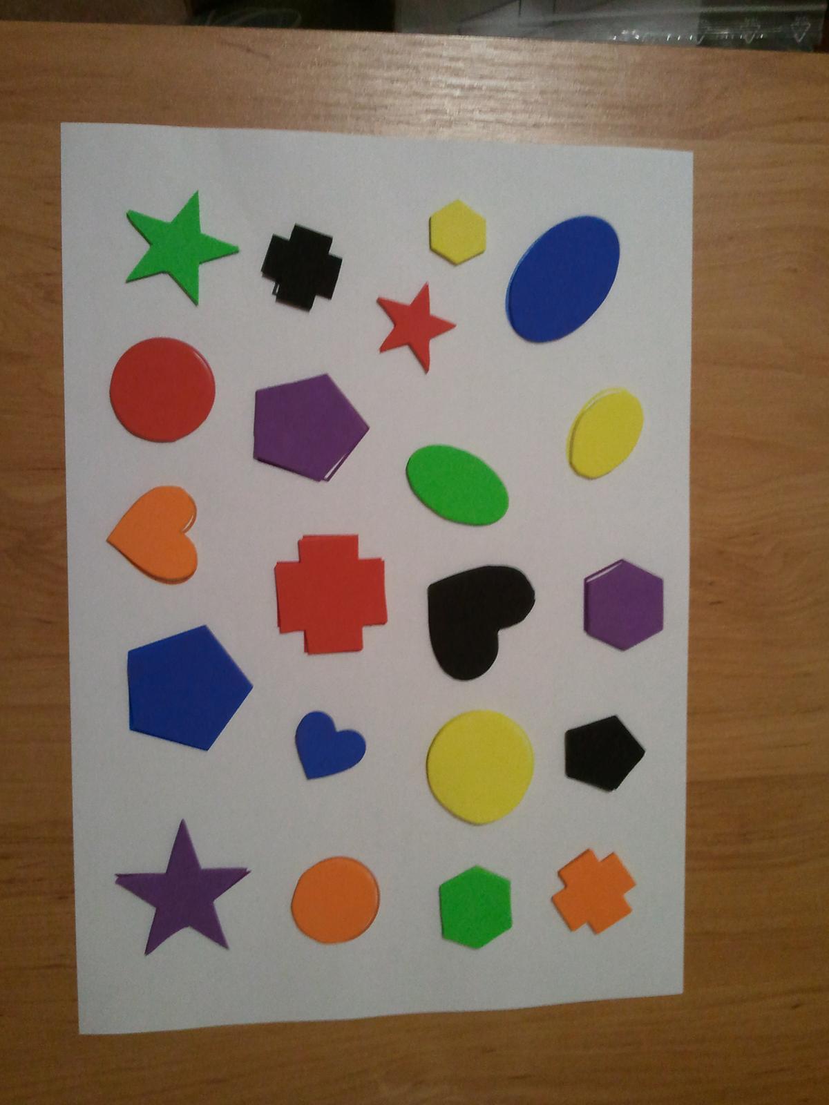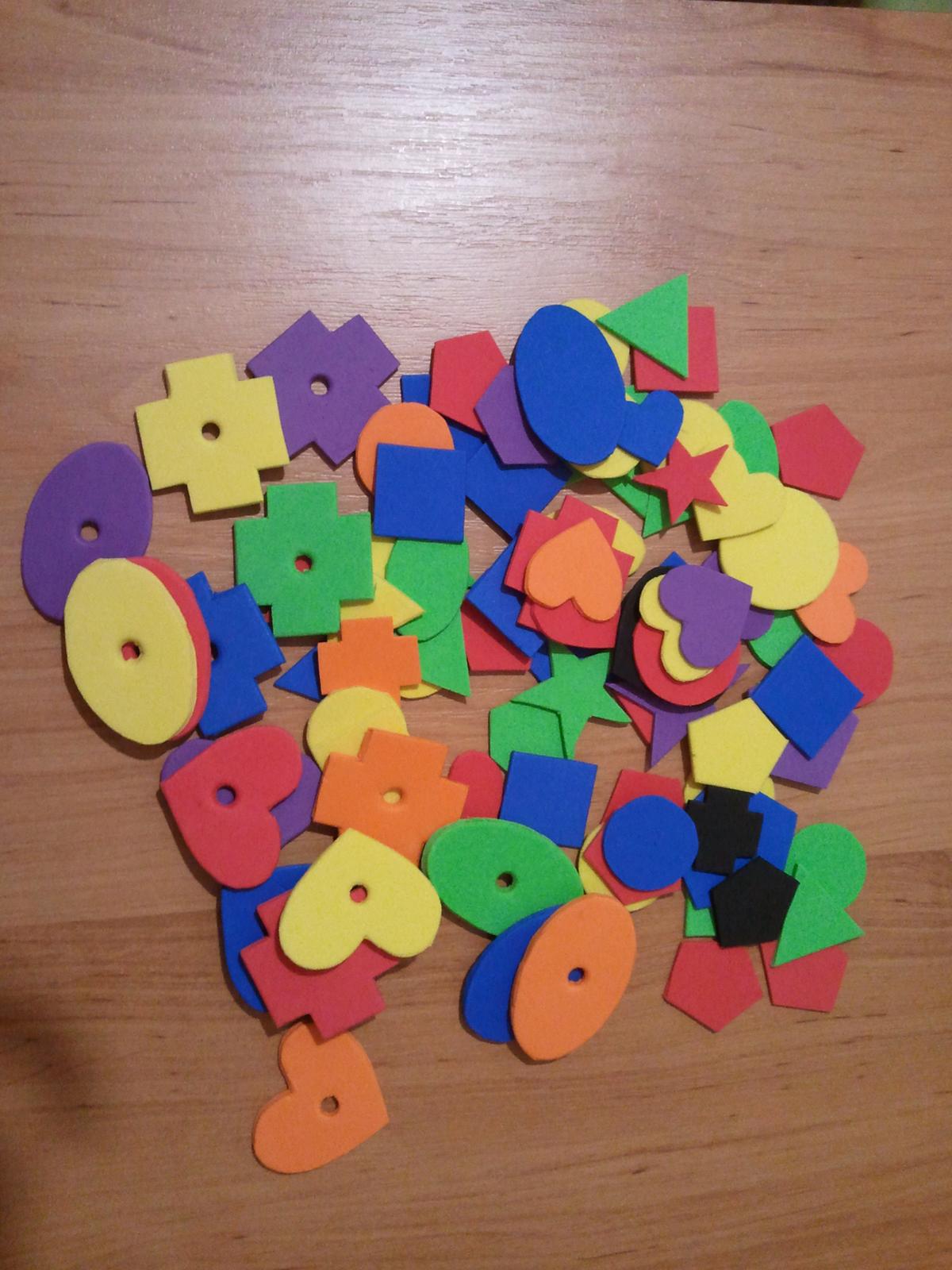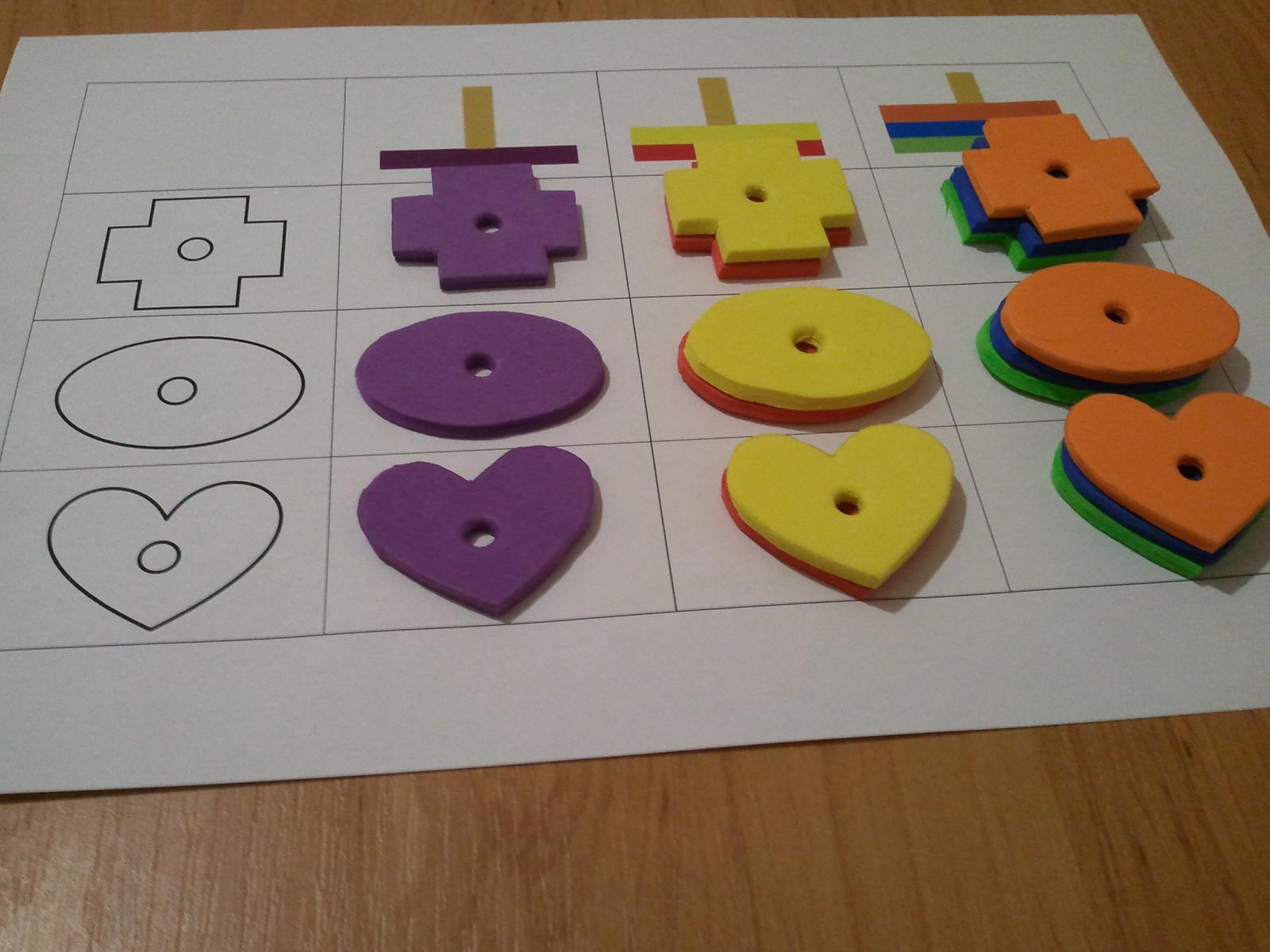 Predloha na navliekanie na paličky podľa tvaru a poradia na paličke - foto 5. Tieto tvary s dierkou sa budú dať navliekať aj na šnúrku (zase pár predlôh a priložená šnúrka). Tvary s dierkou sú zlepované z dvoch vrstiev machovky, tak by bolo vhodné, aby to deti neoblizovali kvôli použitému lepidlu.