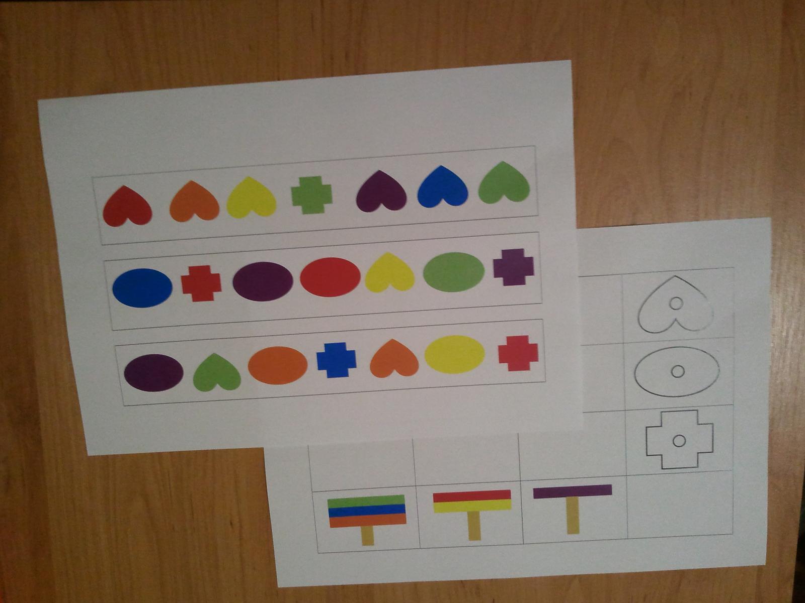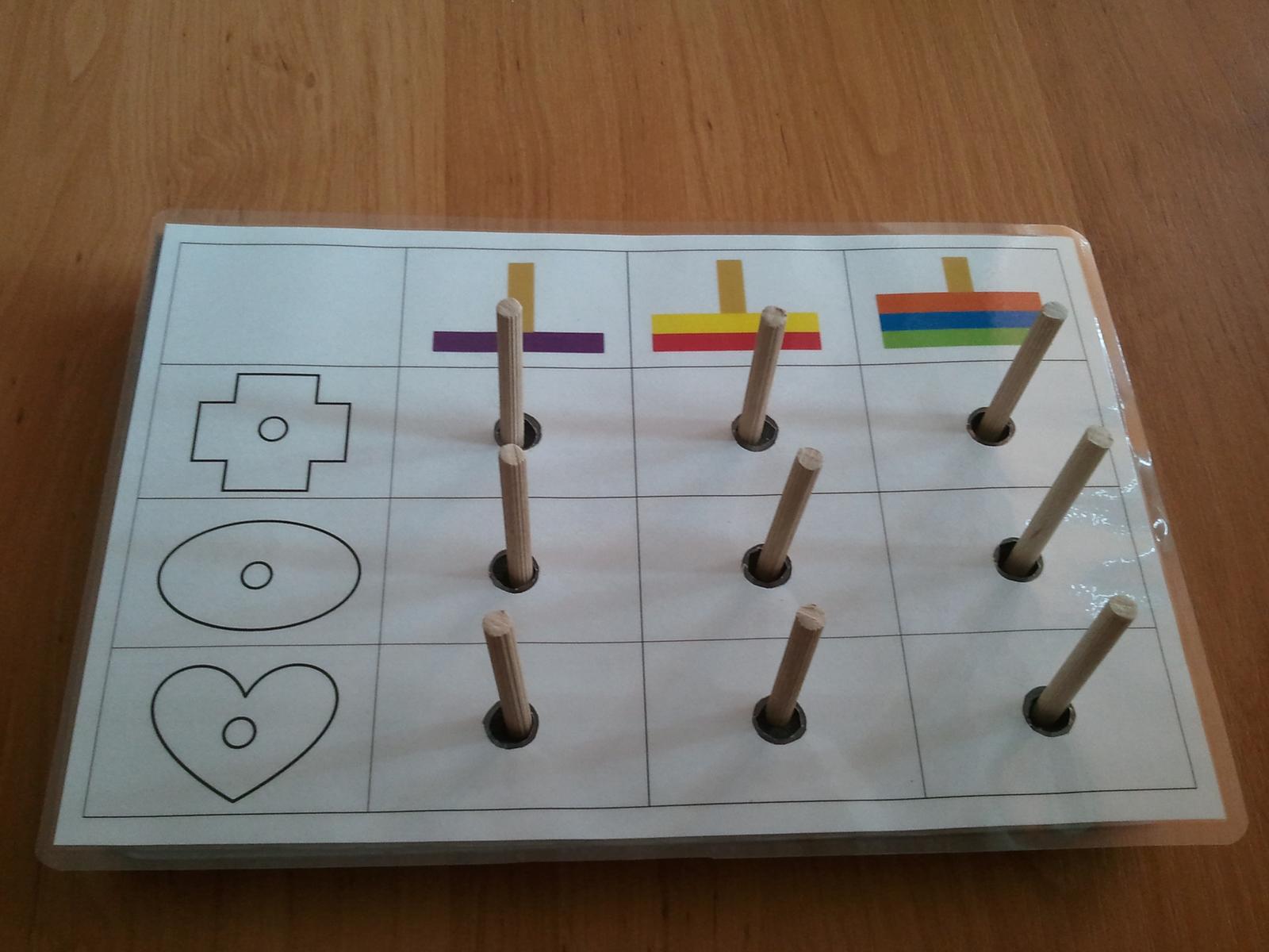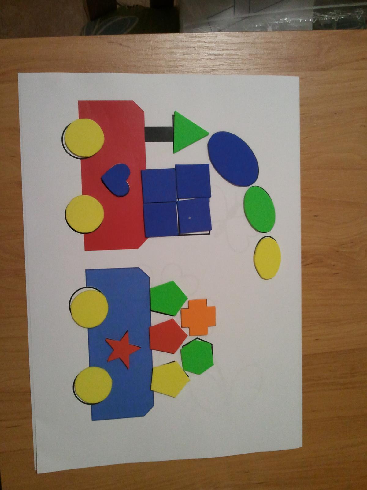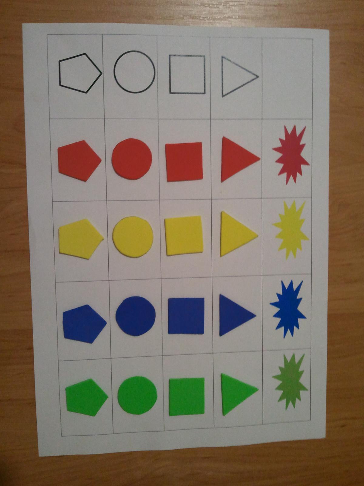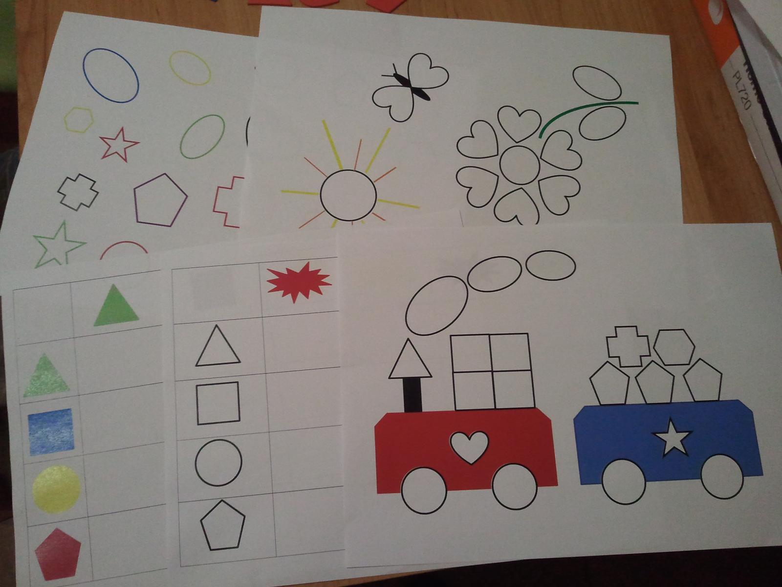 Aktivita pozostáva z dvoch predlôh na dopĺňanie tvarov podľa 2 kritérií /farba a tvar, tvar a tvar/ - prvé dve fotky. Ďalšia predloha je ukladanie podľa farebných obrysov (foto3) - možnosť využiť tvary aj na triedenie malý, stredný , veľký - foto 4
