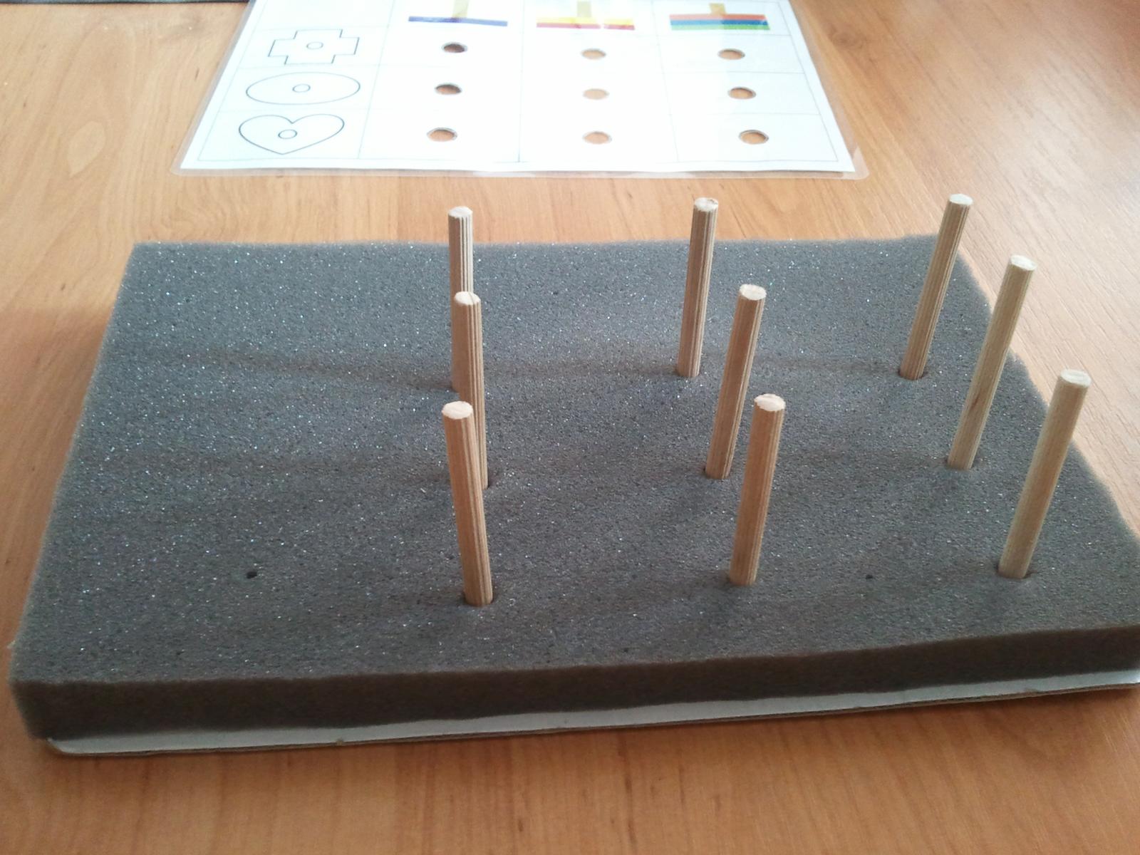 a takto bude vyzerať tá podložka - nie to nič moc (nakoľko už bolo nad moje finančné možnosti kupovať ďalší materiál, využila som to čo som našla doma (pena a kartón). Účel to samozrejme splní - kolíčky budete mať pribalené zvlášť z priestorových dôvodov - tak si ich doma iba zapichnete do podložky (ˇprípadne aj nalepiť, ale drží to dobre aj bez lepenia) - otvory tam už budú naznačené.