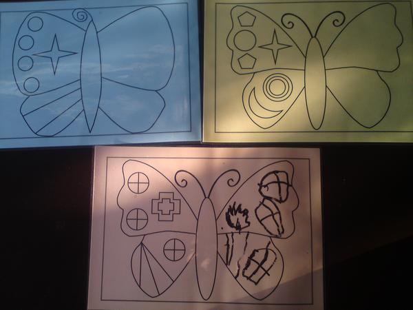 nase symetricke motyle - jemna motorika, pozornost, koordinacia oko - ruka, nazvy tvarov, pocitanie /pocet tvarov/..atd... neskor subezne kreslenie oboma rukami - synchornizacia hemisfer..... /prip. zatial pre maminku 🙂 /