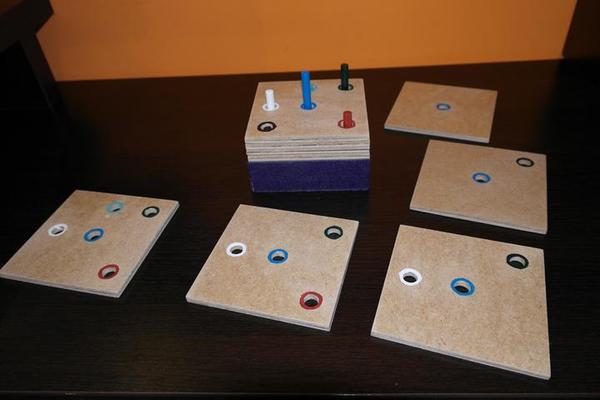 Takto nejako by to vyzeralo, len by boli rôznofarebné štuple a aj zalaminátované predlohy s farbami, resp. v druhej alternative by boli na stuplikoch nalepene obrazky a tie iste na predlohách.