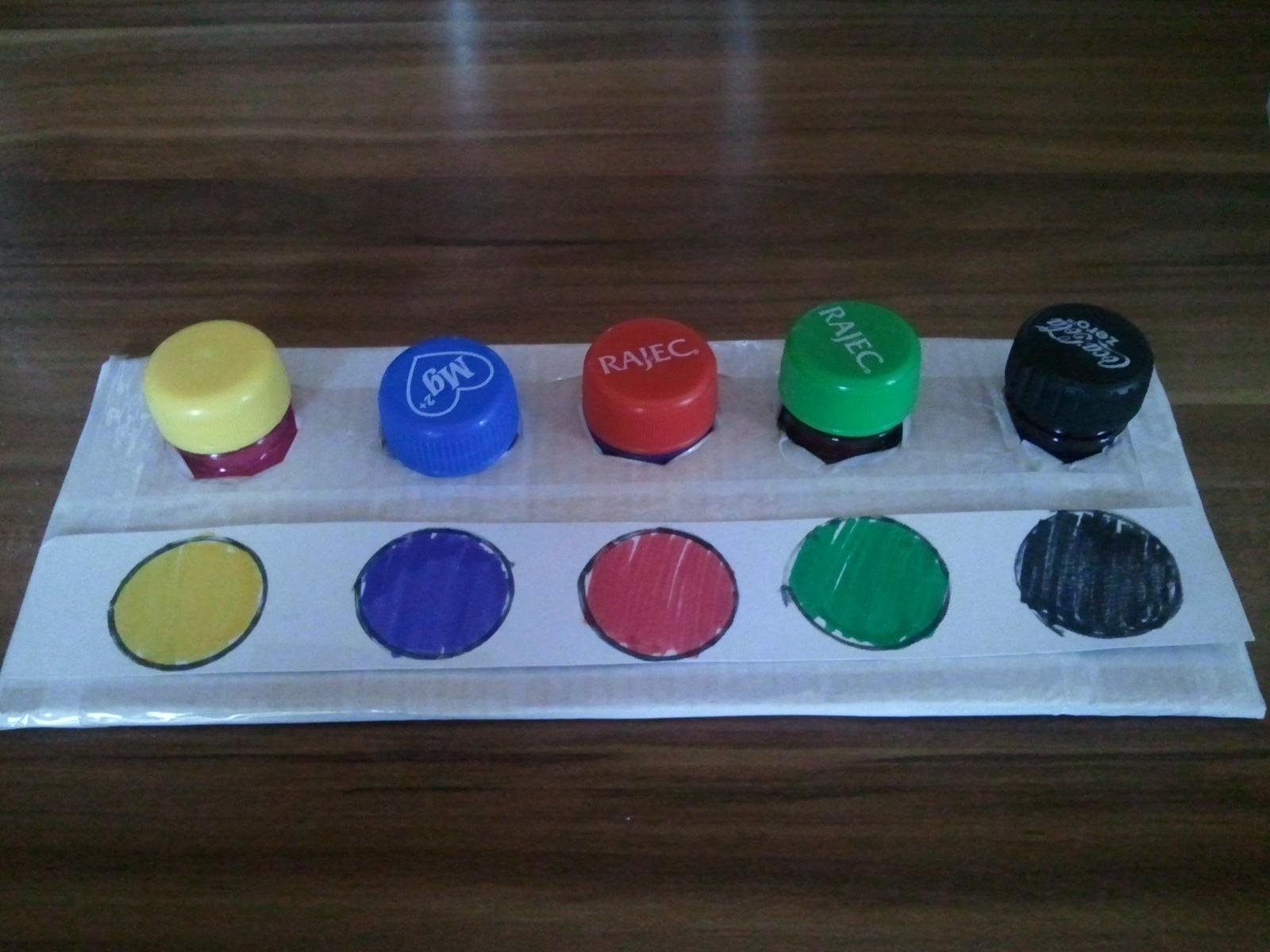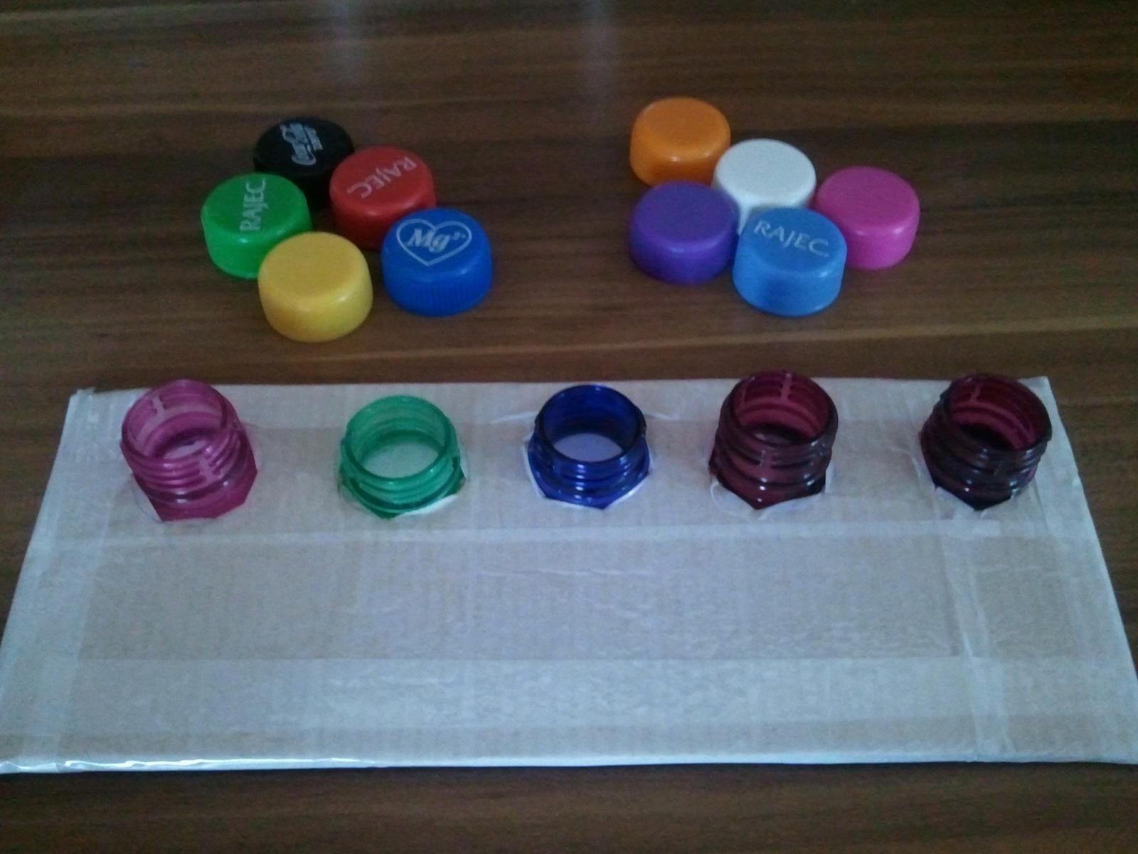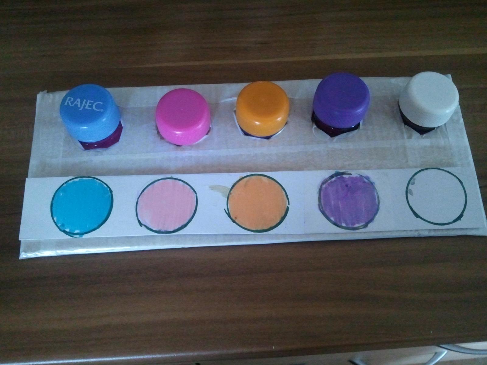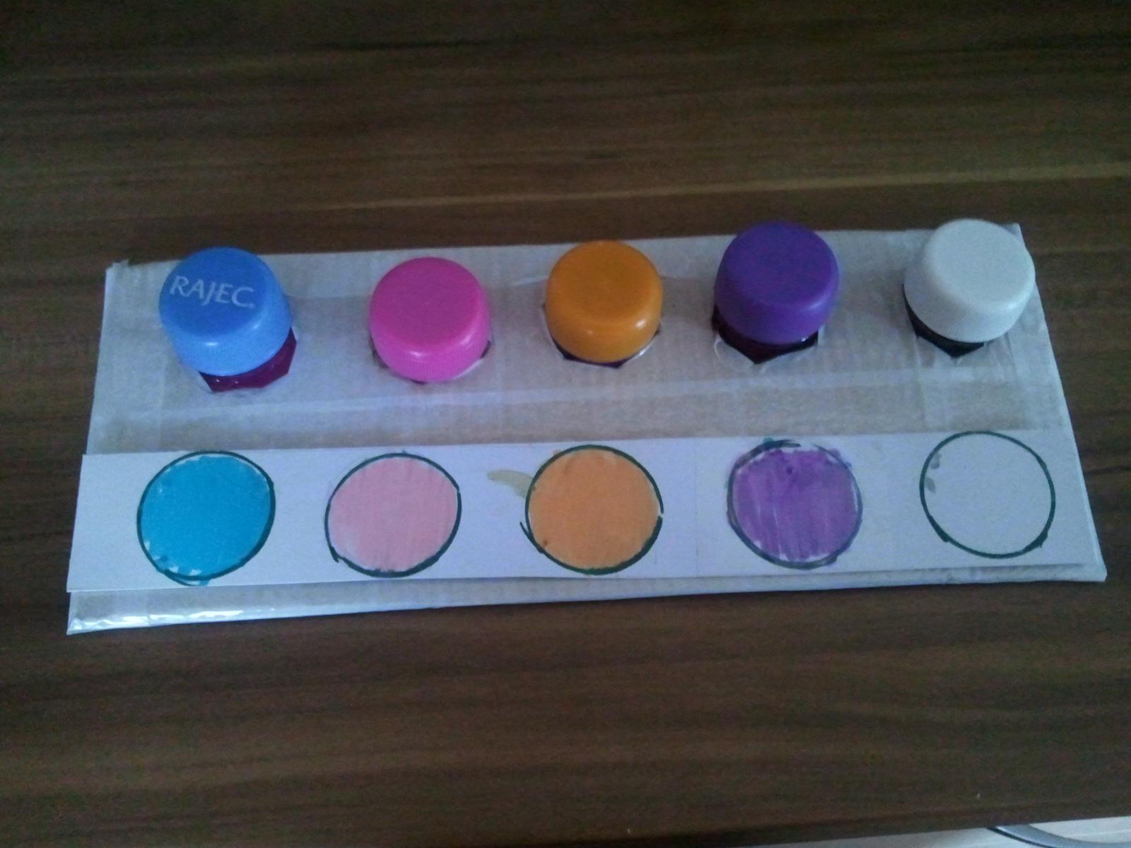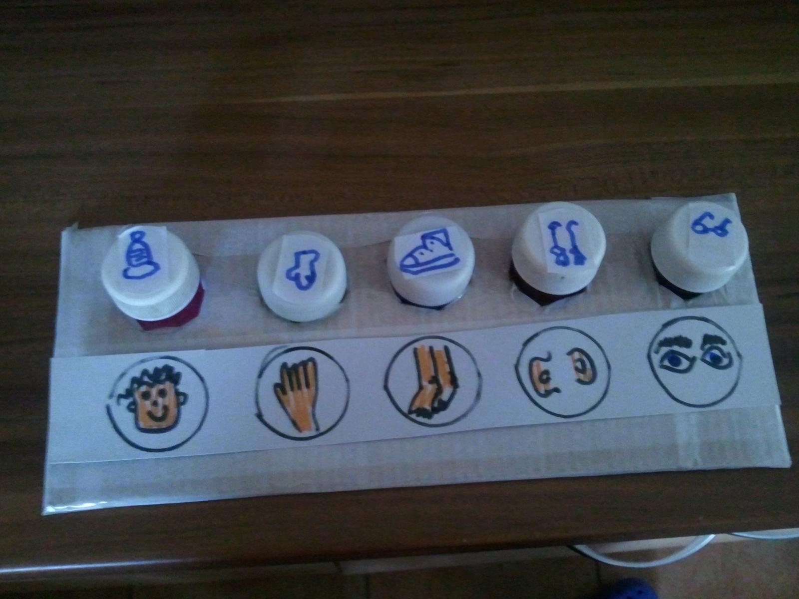 Urobila som dnes prototyp tých vrchnákov. Prikladám foto - podklad budú tvoriť 2 obdĺžniky z 5vrstvového kartónu, obalené to bude bielou lepiacou páskou. Závity z fliaš sú prilepené medzi tie dve vrstvy, tak by to malo držať -ešte testujeme odolnosť prototypu. K aktivite vyrobím zalaminátované obojstranné predlohy. Keďže už máme vo viacerých aktivitách priraďovanie farieb, rozhodla som sa pridať ešte nejaké alternatívy. Takže na jednej predlohe by to boli farby, na druhej priraďovanie oblečenia k častiam tela a priraďovanie potravy k zvieratkám. Tie obrázky budú samozrejme pekné farebné vytlačené - toto je len náčrt ako by to asi vyzeralo - ospravedlňujem sa za svoje maliarske "umenie" 🙂