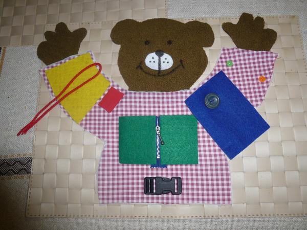 Baby, takto nejako by macko mal vyzerať, zatiaľ to ešte nie je začistené, prišité, ideme zľava: šnurovačka, sucháč, v strede zips, gombík, patentka/y. V páse je ľadvinková spona. Používam filc, na sucháč a ľadvinkovú sponu dám nejakú pevnejšiu látku alebo popruh, uvidím, čo by bolo na patentkách. Ak máte nejaké pripomienky alebo nápady, píšte. 🙂 Ak je to OK, tiež dajte vedieť, nech začnem našívať. Zatiaľ mám všetko v takých polotovaroch. 😅