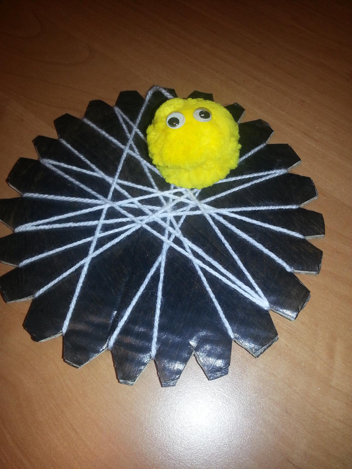 Ahojte maminky tak som dnes urobila jednu moju aktivitku a celkom sa mi pozdáva, zlepila som dva kartóny duvilaxom dokopy, nechala zaťažené poriadne vyschnúť, nafarbila som to čiernou temperou a zalakovala lakom na detský nábytok, pavúka som nakoniec vymyslela z tých kupovaných bombuliek, ale čierne som nedostala len také farebné, neviem čo nato poviete ale mne sa to farebnejšie páči viac, nie všetko také čierne 🙂 aj keď pavúky až také farebné nie sú 🙂, na obrázku ktorý som dala ako návrh má pavúk aj nohy, ja som mu ich nedala lebo keď som išla robiť pavučinu je praktickejšie ak je vlna namotaná na tej bombulke a postupne sa odvíja...inak by to bolo strašne nepraktické a detičky by to nevedeli, keby tam boli tie nohy zavadzali by...ešte k výrobe, natretá a nalakovaná je len jedna strana, neviem či chcete aj druhú na druhej strane je vidieť normálne kartón...takže kľudne mi píšte nejaké zlepšováky ak vás napadne 🙂 😎
