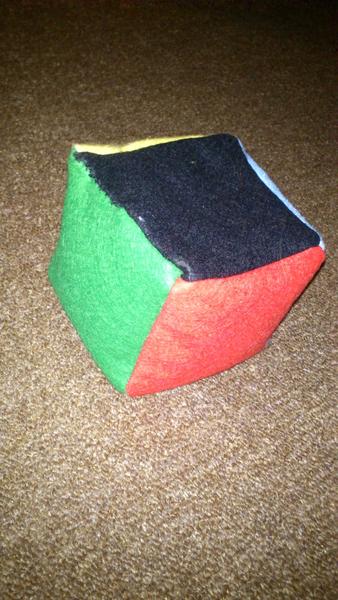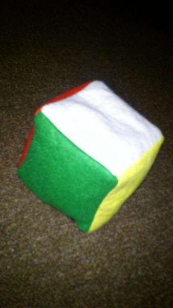 Prvy prototip je filcova kocka o rozmere cca 8x8cm, naplnila som ju ryzou+polystyrenovymi gulickami co byvaju v kojacom vankusi... aby to nebolo velmi tazke, ale ani lahucke...