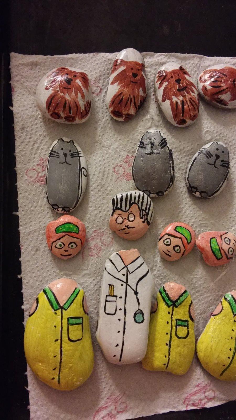 @adelajda2012 ja uz tu zakladnu sadu kamienkov mam hotovu dedko, babka, otec, mama, dcera,syn, babatko. len uz mi dosli sutre. mam v plane ist na dalsie, len sm tehotna a trochu mi zacalo tvrdnut brucho, tak sa setrim. a dost zle sa mi zohyba ku kamenom🙂 takze ak sa mi podari tento vikend alebo ten dalsi, este by som nieco este urobila, ale slubit vam to nemozem. premyslala som, ze napriklad nejaku postavicku - napr. doktora. alebo neviem, proste nieco typicke co sa da identifikovat podla oblecenia. pripadne kocky nemate tip? este som premyslala, ze mozno nejak zviera - macka alebo pes, ale to nenajdem taky tvar sutra, trakze by to nebolo na cely kamen a okolie by som musela namalovat nacierno - a neviem, ci by to pekne vyznelo...
