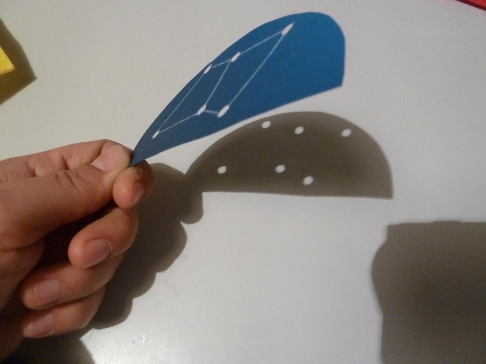 Dievcata ospravdlnujemsa ze az teraz pridavam, fotky, ale som fotak zabudla u babky, tak preto az teraz a preto som aj ostatne aktivity este nefotila. Pridavam vam fotku ako sa presvecuju tie suhvezdia. Vybrala som suhvezdie orion a pri svetle silnej zarovky stropnej lampy som podrzala karticku asi 4cm nad stolom-prva foto. A potom v tmavej izbe pri svetle baterky skusila presvietit na stenu. Aby ste to aspon priblizne videli., ze na stole sa to da takto pozriet a na stene tak.