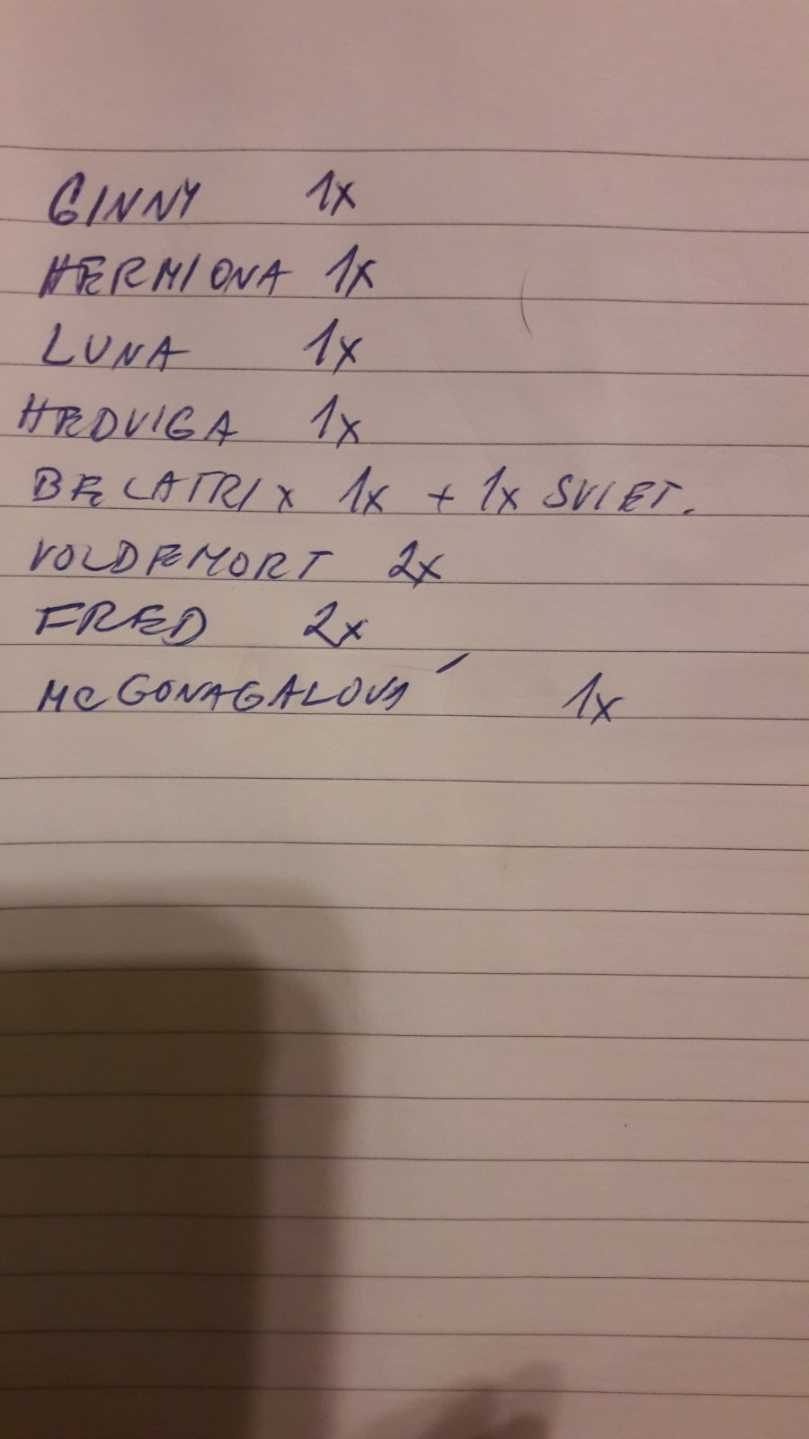 Zháňam figúrky: Ron Weasley, Ginny Weasleyová a Luna Lovegoodová. Na výmenu mám: Sirius Black, Neville Longbottom, sova Hedviga a neviditeľný Harry Potter.