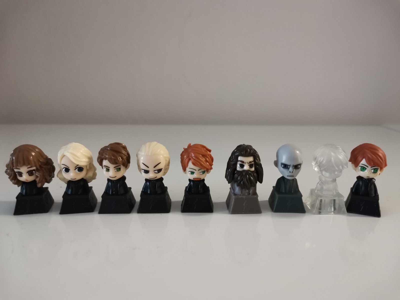 Ahojte, ponukam tychto na foto za 40c / kus, plus postovne, okrem Dobbyho, ten je zadarmo, ak by ho niekto chcel (je poskodeny - oddeluje sa bezova farba od sedej). Sorry za kvalitu foto, fotene v noci. :D Ponukam: 2x Hagrid, 1x Neville, 2x svietiaci Voldemort, 1x Voldemort.