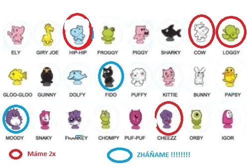 Vymena: 2x papsi, 1x ely, 1x snaky, 1x guinny, 1x gloogloo, 1x giry joe, 1x hiphip, 1x frogy/zaba/ a 1x cow