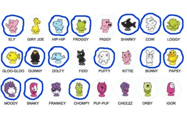 ahojte.....chýbajú nám Moody,Cheez,Orby,Papsy,Cow,Sharky a Gloo-Gloo....vymeníme za Kittie,Loggy,Puffy,Dolfy a Ely
