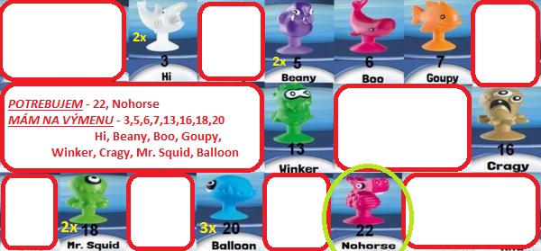 @timii69 mame pre vas nohorse. Vymenime s vami za Hi, pripadne od vas dokupime dalsich. Chybaju nam este Sweety, Goupy, Clam, Billy, Turbo, Winker, Drup, Mr. Squid, Chukapi a Toodalou.