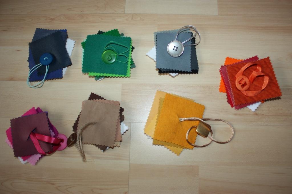 Prve - trenovanie zapinania gombikov, triedenie odtienov, rozne materialy na latkach a gombíkoch