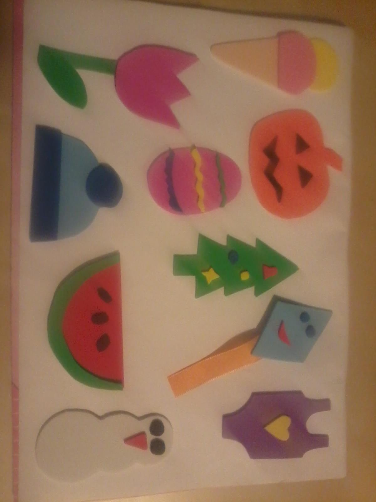 Takze baby foto ako bude asi vyzerat druhy harok. Prvy bude priradovacka tvarov- to uz som pridala foto. Drhy bude priradovanie predmetov a zaroven ich delenie podla rocnych obdobi. Vybrala som to takto: leto - zmrzka, melon a plavky. Jar - tulipan a kraslica. Jesen - sarkan a tekvica. Zima - ciapka, snehuliak a stromcek. Je to ok?