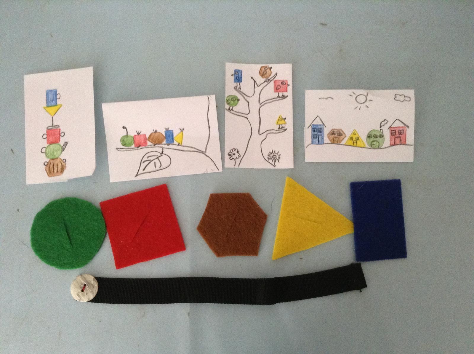 3) navrh z prvej vymeny, ktory mal dost hlasov - navliekanie podla predlohy. Plus kazda by dostala 4sady tych filcovych tvarov, aby sa to dalo hrat aj ako spolocenska hra na postreh (pre vacsich). Na chvilku sa otoci karticka a hraci musia co najrychlejsie postavit tvary v takom poradi a postaveni (v rade alebo v stlpci) ako ich videli na karticke