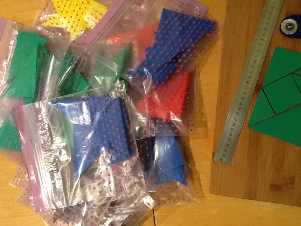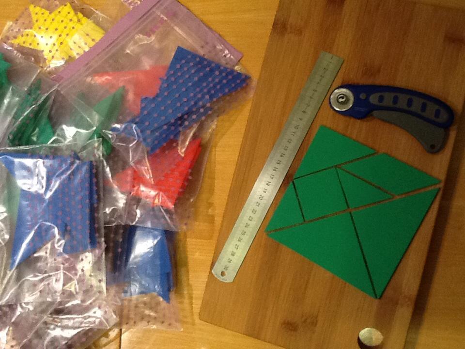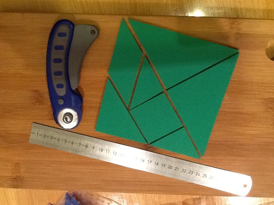 Inak musim priznat, ze som sa trochu preratala co sa tyka prace s machovkou. Som si myslela ake super, chytim noznice a budem strihat. Chachacha. Noznice boli na tuto hrubku uplne nevhodne, viac sekali ako rezali, pri stvrtom vyhodenom tangrame som pochopila a zacala hladat vhodnejsi nastroj. Volba padla na ostry noz. Vyber nie zly, ale ako mi ta guma utekala spod ruk, ciary sa sem tam klukatili. Ked som pri piatom tangrame pochopila, ze sa to uz nezlepsi a chyba bude asi v nastroji, nie v trasucich sa rukach, zacala som patrat na nete. A natrafila som na nieco pre mna uplne nepoznane - rotacny noz. Asi po troch skusobnych tangramoch sme sa skamaratili a rezali, rezali, rezali 🙂 medzitym som si obstarala aj kovove pravitko kedze rotacny noz mi to plastove zrezal 🙂)) priznam sa, uzivala som si to. A dodatocne som ocenila aj mnozstvo nakupenej ma machovky. Akurat cervenej som vela minula pri testovacich zaciatkoch a uz sa mi neda vyskladat 5farebny tangram. Ale mozno pri tak malych detoch a pri zoznamovani sa s tangramom jednofarebnost bude asi aj lepsia. Je to krasna geometria, trojuholniky troch velkosti, stvorec a kosostvorec. Tomu som prisposobila aj predlohy a vyfarbila som ich tak, aby kazdy tangram mal predlohy vo svojej farbe. Posielam foto.