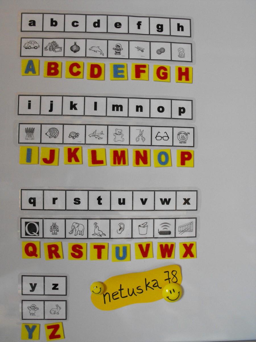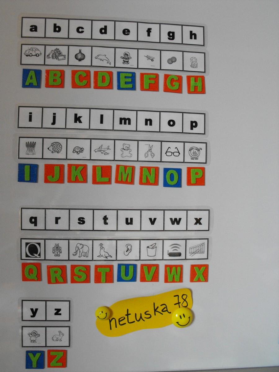 - zalaminovane magneticke karticky - zaradom mala abeceda, plus zvlast karticky obrazky - teda je mozne priradovat stvorceky ku obrazkom, alebo k pismenam malej abecedy (v abecednom poradi)