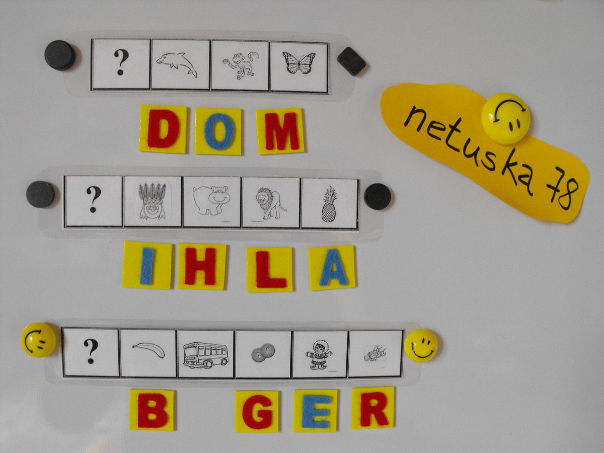 - zalaminovane karticky troj, stvor, pat pismenkove slova ( po pat kusov z kazdeho) - z jednej strany je otaznicek, plus obrazky, k nim sa priraduje pismeno na ktore zacina dany obrazok, karticku je mozne otocit (kontrola) ...teda z druhej strany je obrazok a dane slovo po pismenkach - tuto stranu karticiek mozte pouzit aj ako predlohu na aktivitku od kmotra7...teda s maticami, alebo s navliekanim koralok pismenkovych, ak doma mate, alebo na skladanie penovych puzzli, alebo stipcovanie ak mate pismenka na stipcoch napisane....karticiek je 16 trojpismenkovych, 16 stvorpismekovych a 12 patpismenkovych....okrem spominanych 15 kusov si bude potrebne ostatne zalaminovat, su uz poskladane, obstrihane, len si nezabudnite nechat vacsi okraj laminofolievlavo a vpravo, aby ste mali o co prichytit magnetku 🙂 aby nezaclanala pismenko ci obrazok... tlacila som to na tlaciarni, kde toner nebol prave najnovsi, no myslim ze obrazky su v pohode rozoznatelne, ked sa mi nejake zdali menej vyrazne, vytlacila som este raz a prelepila konkretny obrazok...tak verim ze vam hra posluzi 🙂 moju dcerku zaujala, mame ju pripnutu na magnetickej tabuli 🙂 a dnes sme veselo priradovali a citali 🙂