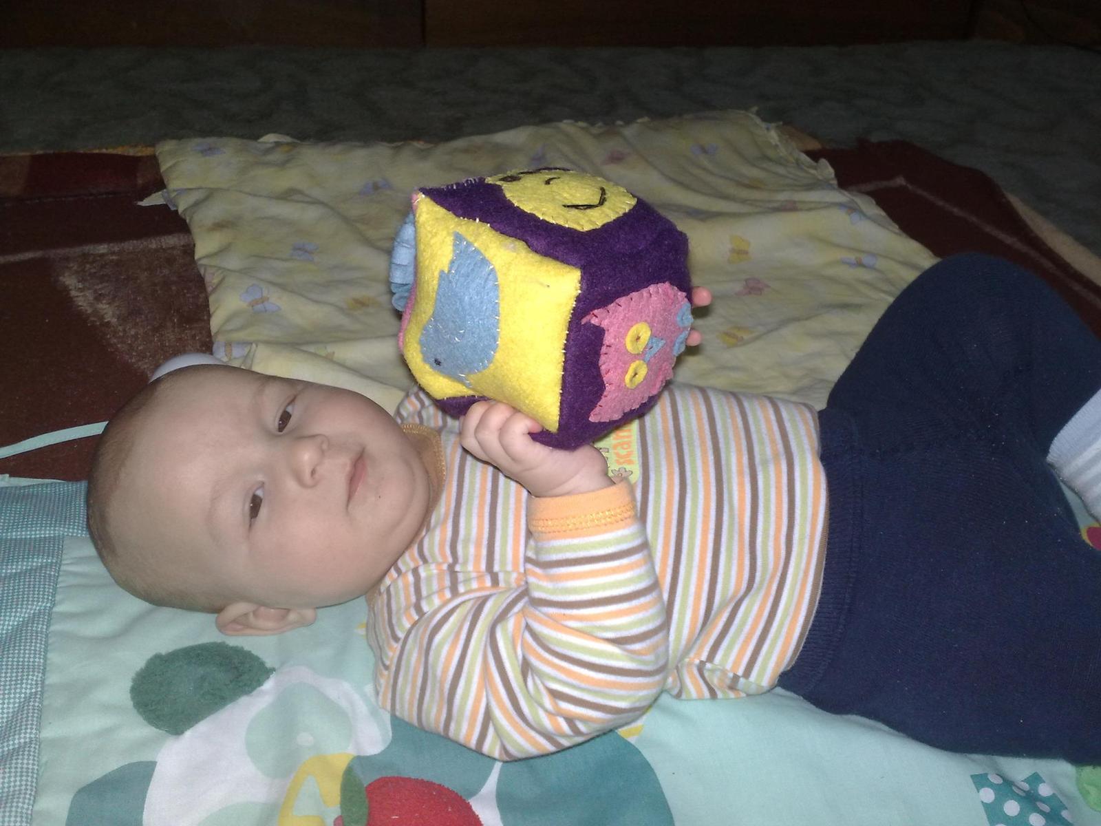 - kocka z filcu,ktora hrka, na kazdej strane je nieco vtacik,slniecko,sova, hviezdicka,zabka