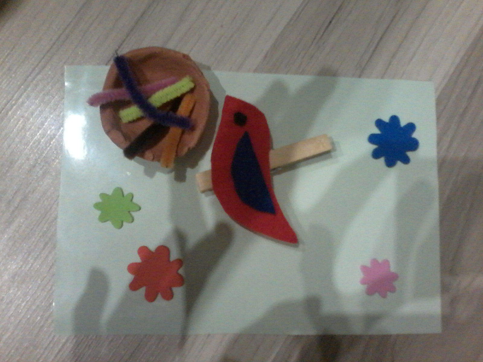 fufina1 kittykittyke @sony2002 @lastovicka01 @gabgabbb @fufina1 @hela_tn @motovidlo @vepiku @merry1 @martina05 @chimsee @kittykittyke @mnique777 @maryennn @mamkabeika @veonka @oveckajanka @skriatko @xarra246 @romanovaz @ivana08 @lindana podklad zalaminovany farebny papier, vtacik filc, hniezdo samotvrdnuca hmota a farebne kvietky z machovej gumy