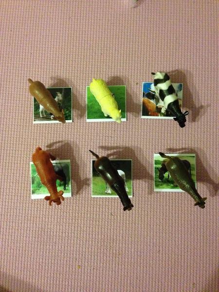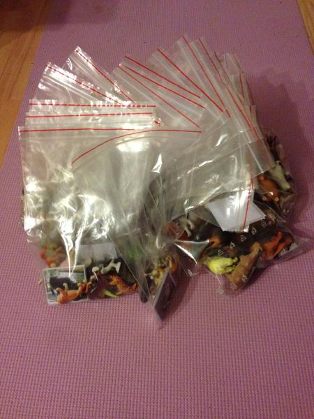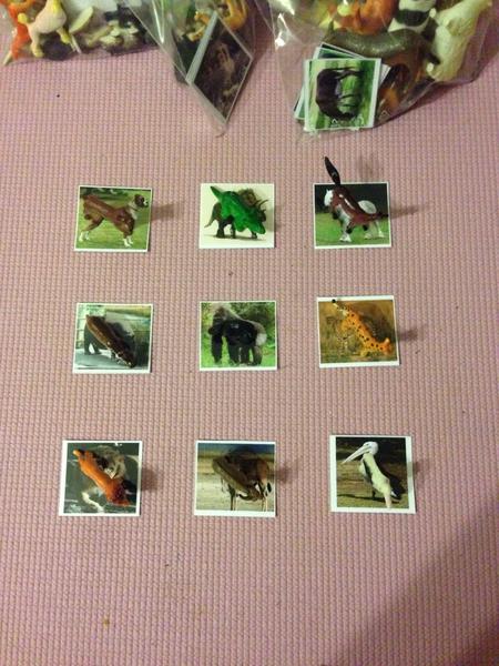 Nakoniec sa mi nepodarilo zohnať toľko rovnakých zvieratiek,takze iba 4ks vrecusok su s rovnakými zvieratkami, tie su väčšie a je ich tam 6 ks. Zvyšné vrecuska majú menšie zvieratká, je ich tam buď 9 alebo 10 ks, pričom som sa snažila zvieratká aspoň tematicky pospájat k sebe do jedného vrecuska, teda podla miesta, kde žijú /Austrália,Afrika,domáce zvieratá a pod/. V každom je však kôň,pes a dinosaurus, tých bolo v balíčkoch strasne veľa,este mi ich dost pozostavalo.karticky su zalaminatovane a vytlačené na tvrdom papieri. Každá si zvaste, ci vam treba zaoblit rohy, u nás ich neoblim..to si popripade dorobite..pridávam aj foto;)