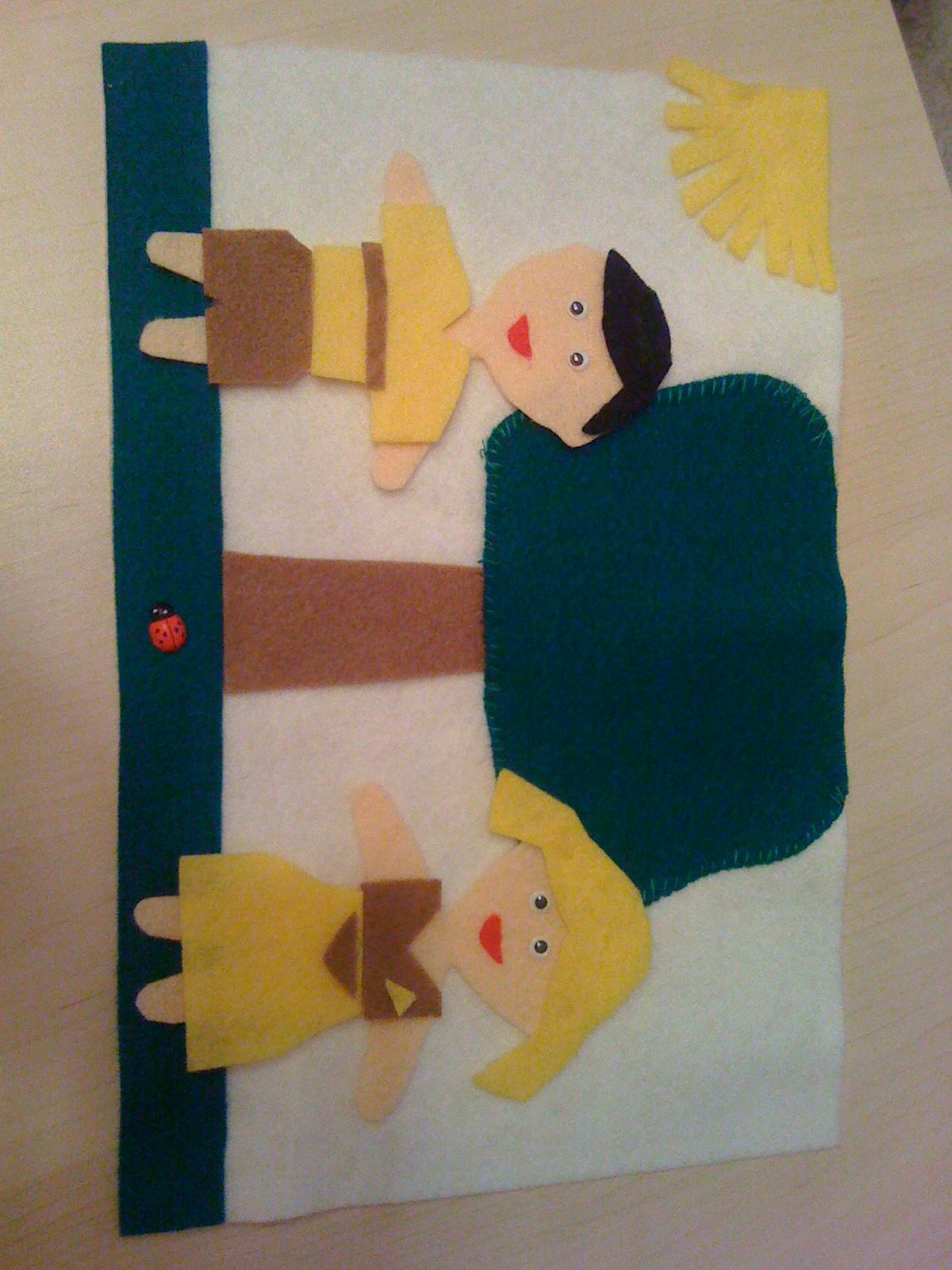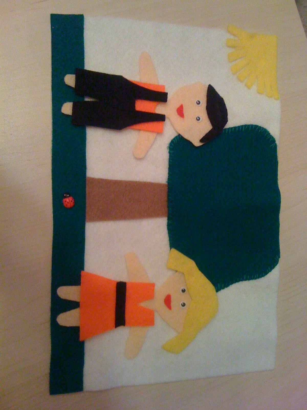 Trava je prizehlena.. Koruna stromu rucne prisita, nalepeny suchy zips, aby oblecenie nevypadlo.. Chlapcek a dievcatko su lepene tavnou pistolou.. kmen stromu a saty su lepene lepidlom na textil.. je vhodne pre deti..