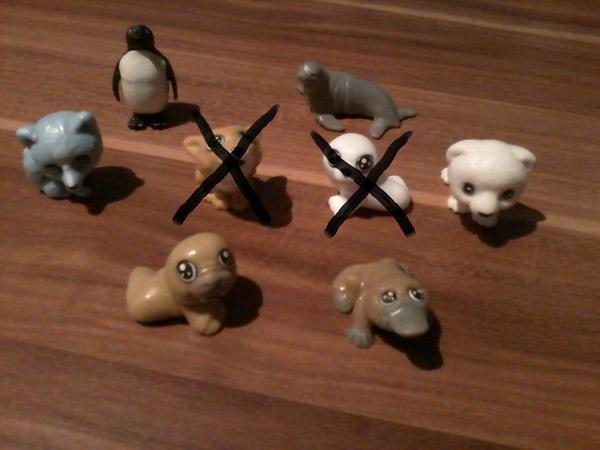 Uz pevnych par rokov nas drzi zbieranie figuriek z Kindervajicok. Poslednu dobu je to strasne. Kedze si vyberam tie tazsie vajicka, nejako sa nam namnozili niektore postavicky, napr. zo serie Atronautov mame asi 3 korytnacky, 3 medvedov a ziadneho papagaja. Zo starsej serie Natoon mame napr. troch hrochov. Ma zaujem niekto povymienat?