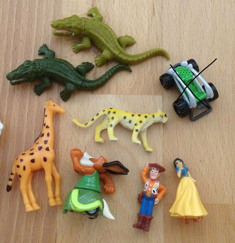 Uz pevnych par rokov nas drzi zbieranie figuriek z Kindervajicok. Poslednu dobu je to strasne. Kedze si vyberam tie tazsie vajicka, nejako sa nam namnozili niektore postavicky, napr. zo serie Atronautov mame asi 3 korytnacky, 3 medvedov a ziadneho papagaja. Zo starsej serie Natoon mame napr. troch hrochov. Ma zaujem niekto povymienat?