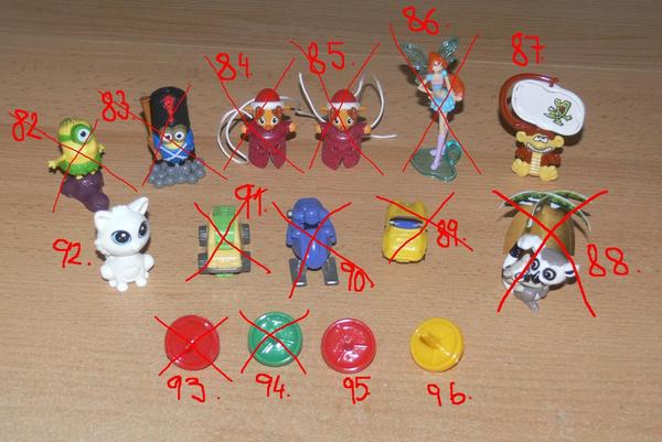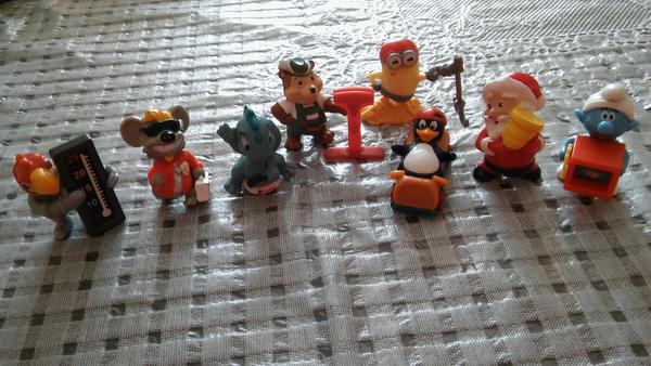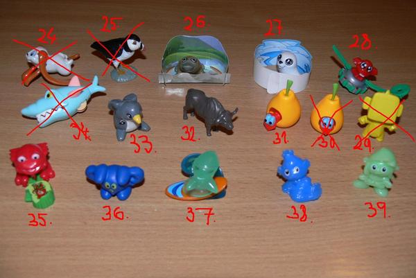 Uz pevnych par rokov nas drzi zbieranie figuriek z Kindervajicok. Poslednu dobu je to strasne. Kedze si vyberam tie tazsie vajicka, nejako sa nam namnozili niektore postavicky, napr. zo serie Atronautov mame asi 3 korytnacky, 3 medvedov a ziadneho papagaja. Zo starsej serie Natoon mame napr. troch hrochov. Ma zaujem niekto povymienat?