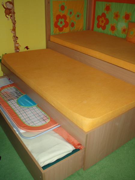 niečo podobné riešim aj ja. Máme 3 dievčatá vo veku 8,5 6 a 4,5 roka. Jedna ide do 3 ďalšia do 1 triedy. Zatiaľ je to tak, že v izbe sú len 2 slečny a najmenšia je s nami. Len urobili sme chybu, že v izbe sú veľké postele - dlhé 205 cm, čo je podľa mňa zbytočnosť. Najlep. by bolo postele predať a kúpiť podst. kratšie. Videla som také...