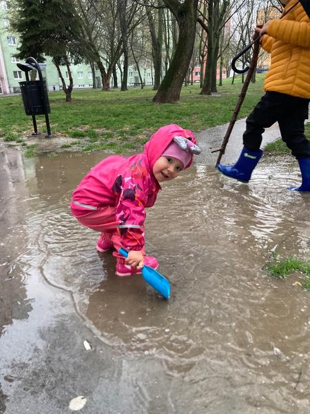 V dazdi je to najlepsie😅... Len treba obliect do nepremokaveho. Nic netreba vymyslat, dieta sa zabavi samo.