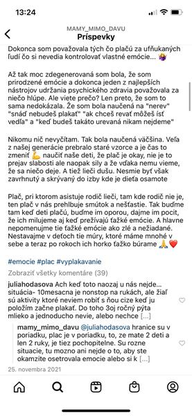 A k tomu teda patri ta najdolezitejsia sprava pre vsetky, ono to chce istu mieru laskavosti aj k sebe samemu aj k ostatnym, aby si tu nepisali 2 tabory takych a inych matiek, ale aby respektovali to ako to ma druhy clovek. Pretoze druha krasna veta Matejckova je, ze najviac ucime, ked neucime, teda ak chceme raz, konecne niekedy mat spolocnost laskavu a ohladuplnu, tak take musime byt na seba, predovsetkym my mamy. Drzte sa, zvladnite, pocuvajte viac babatko a menej okolie, dobry je taky ten vnutorny hlas, ktory vam hovori ako to prave to vase dieta potrebuje. Nie svokra, nie kamoska, nie instagram.