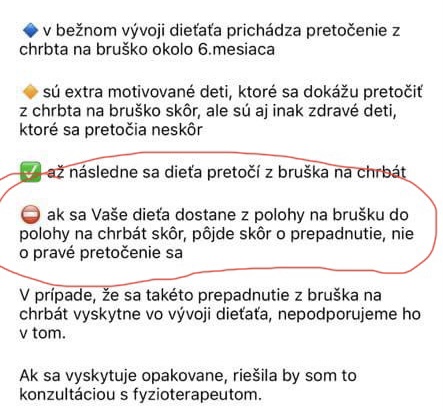 Nestresuj sa, každé dieťa je iné, inak napreduje, iné spôsoby si hľadá,... Niektoré matky by chceli podľa tabuliek a ak to tak nie je, hneď je zle 🤦 pre svoju pohodu sa objednaj u fyzio, ale nemusíš sa báť, že dieťa teraz poznačené bude, že sa pretočí inak ako knižka káže.