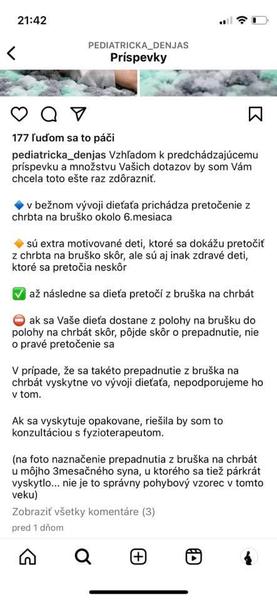 Ahojte, chcem sa opýtať poradiť.. maly má 13t, pekne sa pretáča na bruško od 11/12 týždňa. Celkovo je popredu vo veľa veciach.. Pediatrička chválila, že je šikovný, ešte srandovala ze taketo šikovne bábätka zvyknú byt vrcholový športovci. No na Facebooku má v jednej skupine vystrašili matky, ze to nieje zdravé, je to strašne skoro, mám ísť hneď k fyzioterapeutke. Že nejde o pretáčanie ale o prepadnutie … čo si o tom myslite ? Dosť má vystrašili