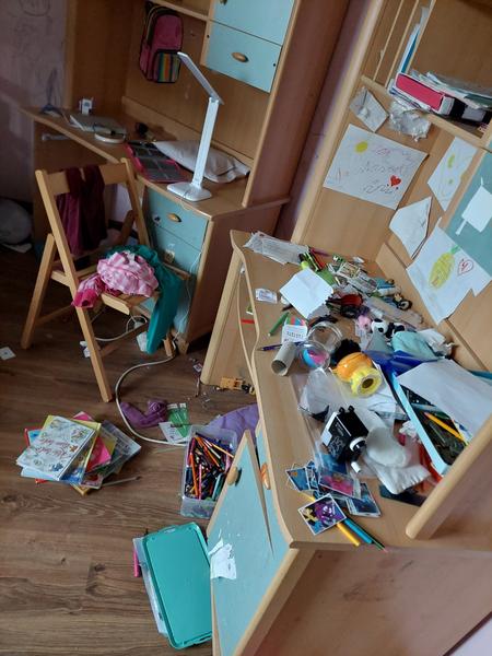 @nana174 - no neviem, ako dlho trvá školáčkam vyrobiť takýto neporiadok? Naši si jednoducho musia upratať veci predtým, ako idú spať. Všetko má svoje miesto, ja ich učím od malička, že keď dajú vec, ktorú nepotrebujú hneď tam, kam patrí, tak nebudú musieť upratovať toho veľa. Mne sa nechce riešiť - Mami, nevieš kde mám...?... No nie, neviem, ak to nie je tam, kde to má byť, tak netuším, kam ste to dali.