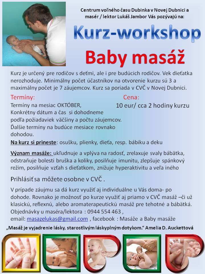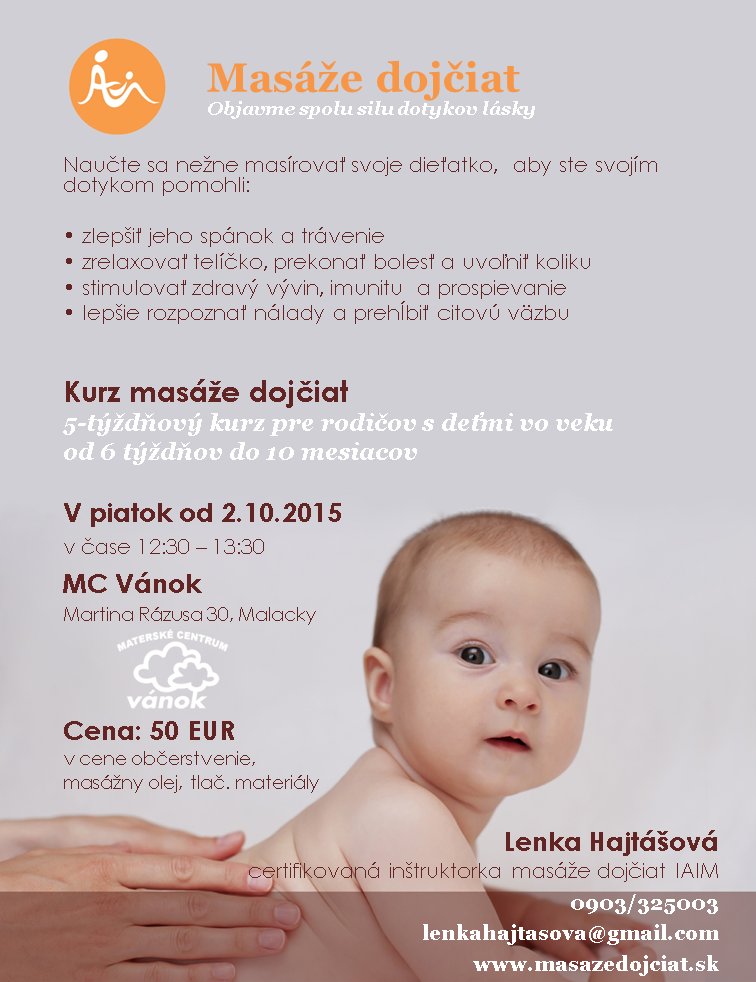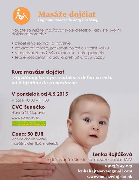 Ahoj Mamicky. MC Srdiecko v Trencine otvorilo novy kurz masazi babatiek, este su volne miesta. Kurz byva v utorky o 16:00 na Dlhych Honoch.