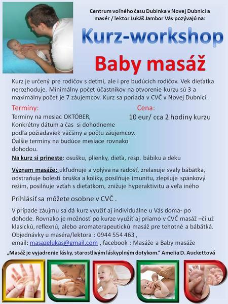 @petulienka211 ahoj, ja idem zajtra na kurz detskych masazi, www.maternitycare.sk Chodila som tam cvicit aj ako tehotna a aj teraz s malym, je to super. Zajtra je o 15:00 a budu vraj aj dalsie terminy, tak pripadne obcas pozri ich stranku.