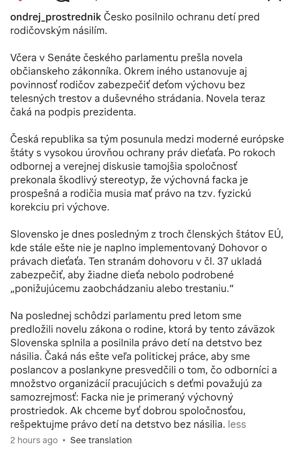 @tatiana234 vôbec sa nečudujem, že je naša spoločnosť tam, kde je. Áno, capnutie po zadku je bitka. Neexistuje žiadna forma “miernejšieho násilia” ktoré by zrazu nebolo násilím. Také malé dieťa sa nevie ani brániť a ani nevie pochopiť súvislosti. Že hodí 2x vedierko? Je to malé dieťa, zdĺhavé vysvetľovanie je zbytočné a bitka už úplne. Treba mu to zobrať a skúsiť ukázať niečo iné, s pokojom, napríklad. Ja mám dieťa, ktoré nespadá do tabuľky “poslušný na prvý pokyn”, extrémne nespavé a aktívne a NIKDY som ju neudrela. Dnes, keď ju porovnám s rovesníkmi, ktorí majú “správnu výchovu” v podobe bitiek tak je úplne niekde inde, slušná, priateľská, všetko si dá vysvetliť. Ja ale ani nechcem mať poslušné dieťa, ja chcem dieťa, ktoré rozumie tomu, aké následky má jeho konanie, ktoré sa samé vie rozhodnúť a ktoré sa riadi svojim rozumom, a nie strachom z bitky. Rešpektujúca výchova nie je to isté ako benevolentná výchova. Moje dieťa hranice má, vybudované s rešpektom a pokojom. Vie, že nie znamená nie, a zároveň vie, že môže za mnou prísť nahnevaná s plačom, lebo ja sa nebudem hnevať za to, že ona je nahnevaná a zároveň to neznamená, že dostane bitku alebo jej splním čokoľvek, čo chce, len až neplače (“nehuláka”) a dá “pokoj”.